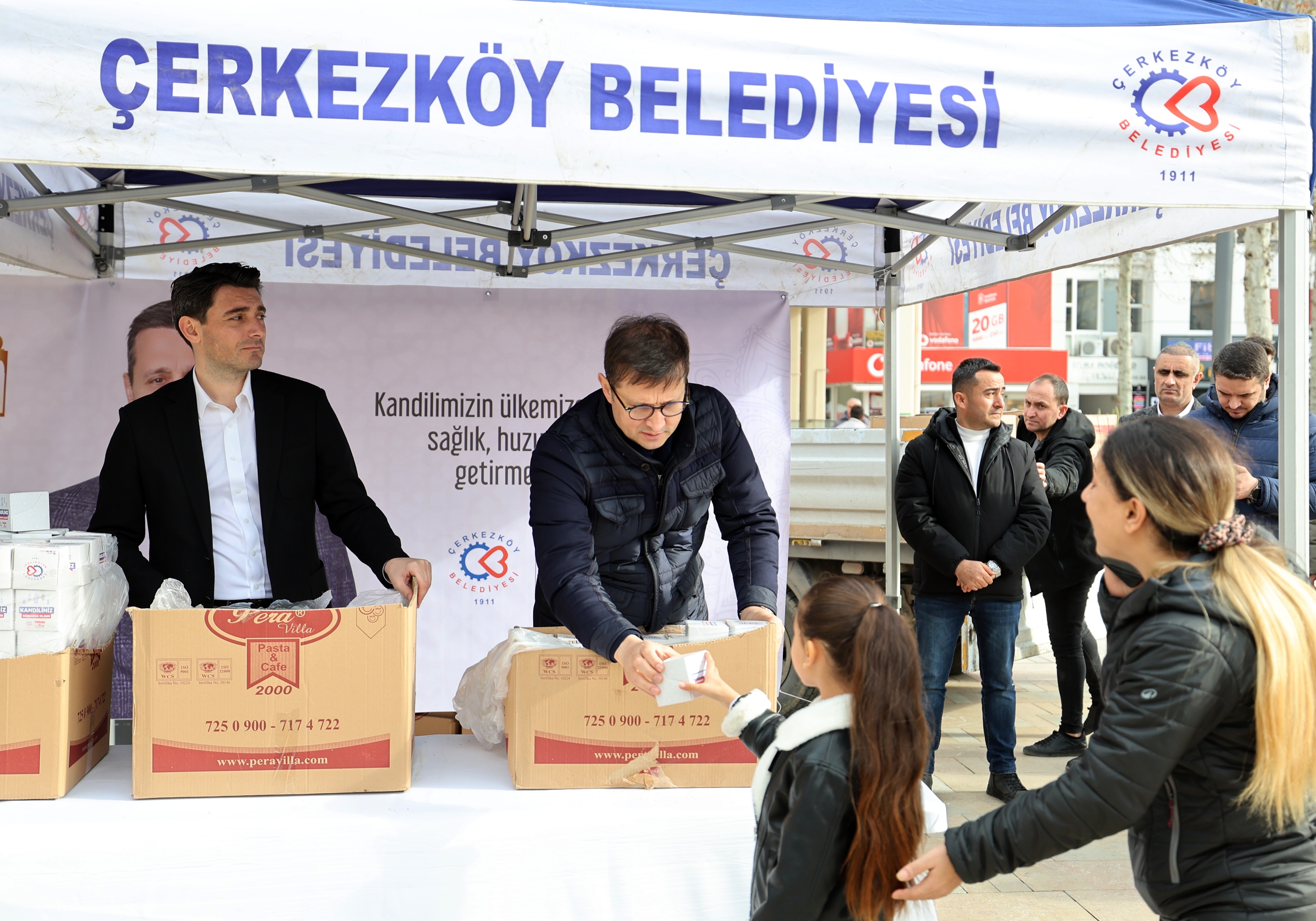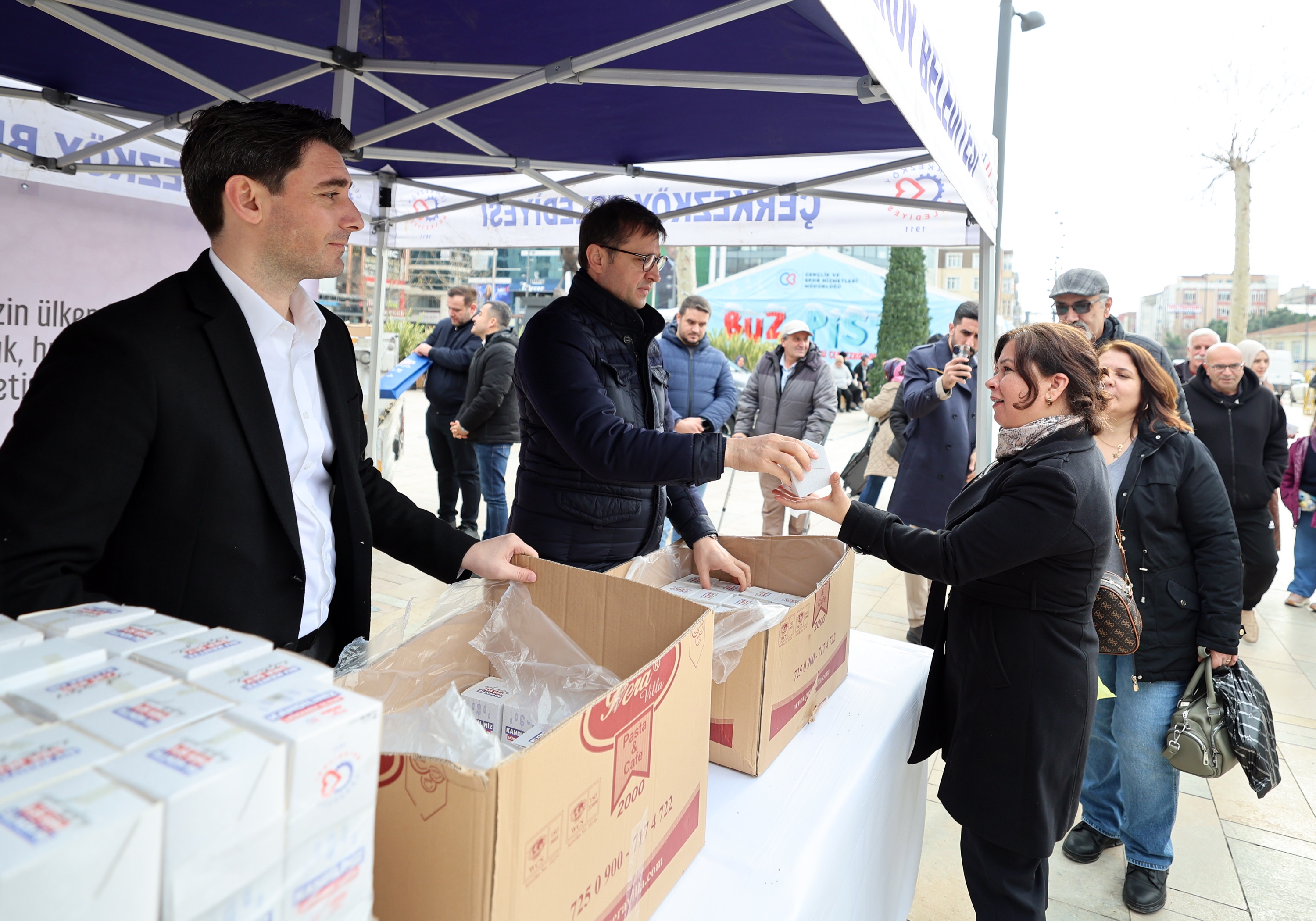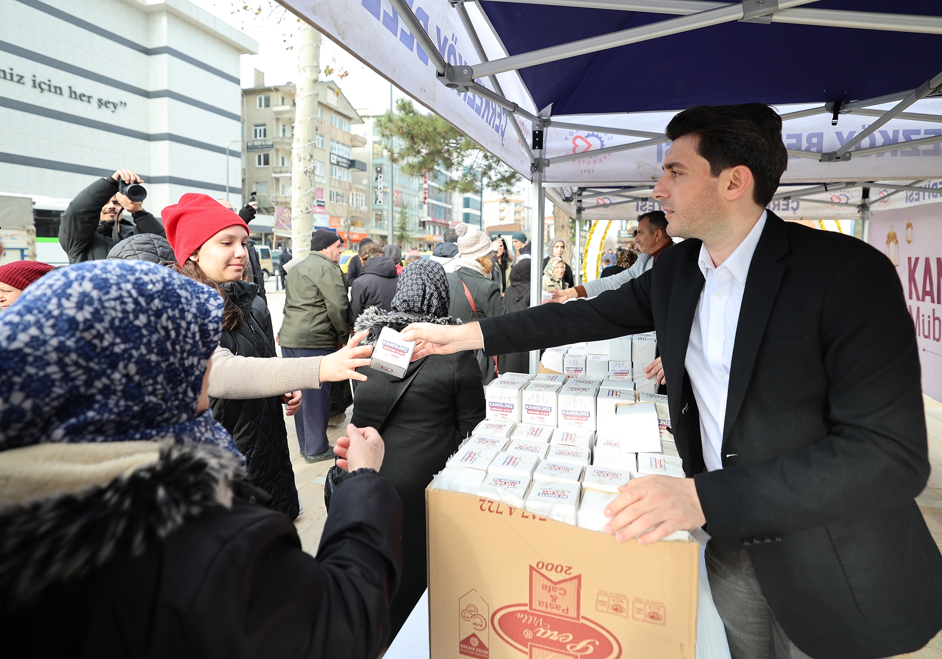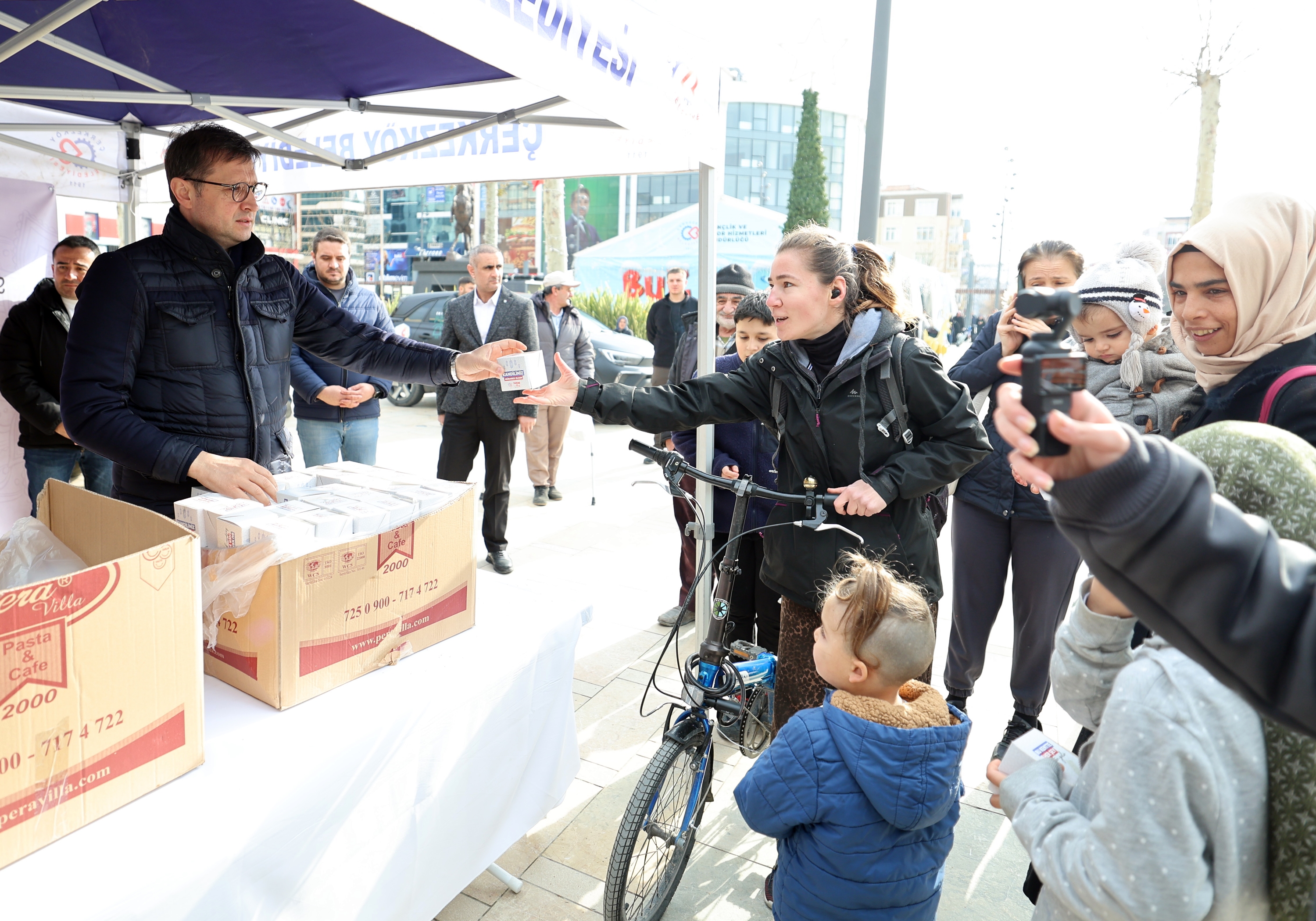 Miraç Kandili nedeniyle Sosyal Hizmetler Müdürlüğümüz tarafından kentimiz genelindeki kamu kurum ve kuruluşları ile Cumhuriyet Meydanı’nda oluşturulan stantta vatandaşlarımıza kandil simidi ikramında bulunuldu. Kandil simitlerini Belediye Başkanımız Vahap Akay, Belediye Başkan Yardımcılarımız Gökay Keleşoğlu ve Yunus Erçin’in elinden alan vatandaşlarımız Çerkezköy Belediyesi ve Belediye Başkanımız Vahap Akay’a kandil simidi ikramlarından dolayı teşekkürlerini ilettiler.