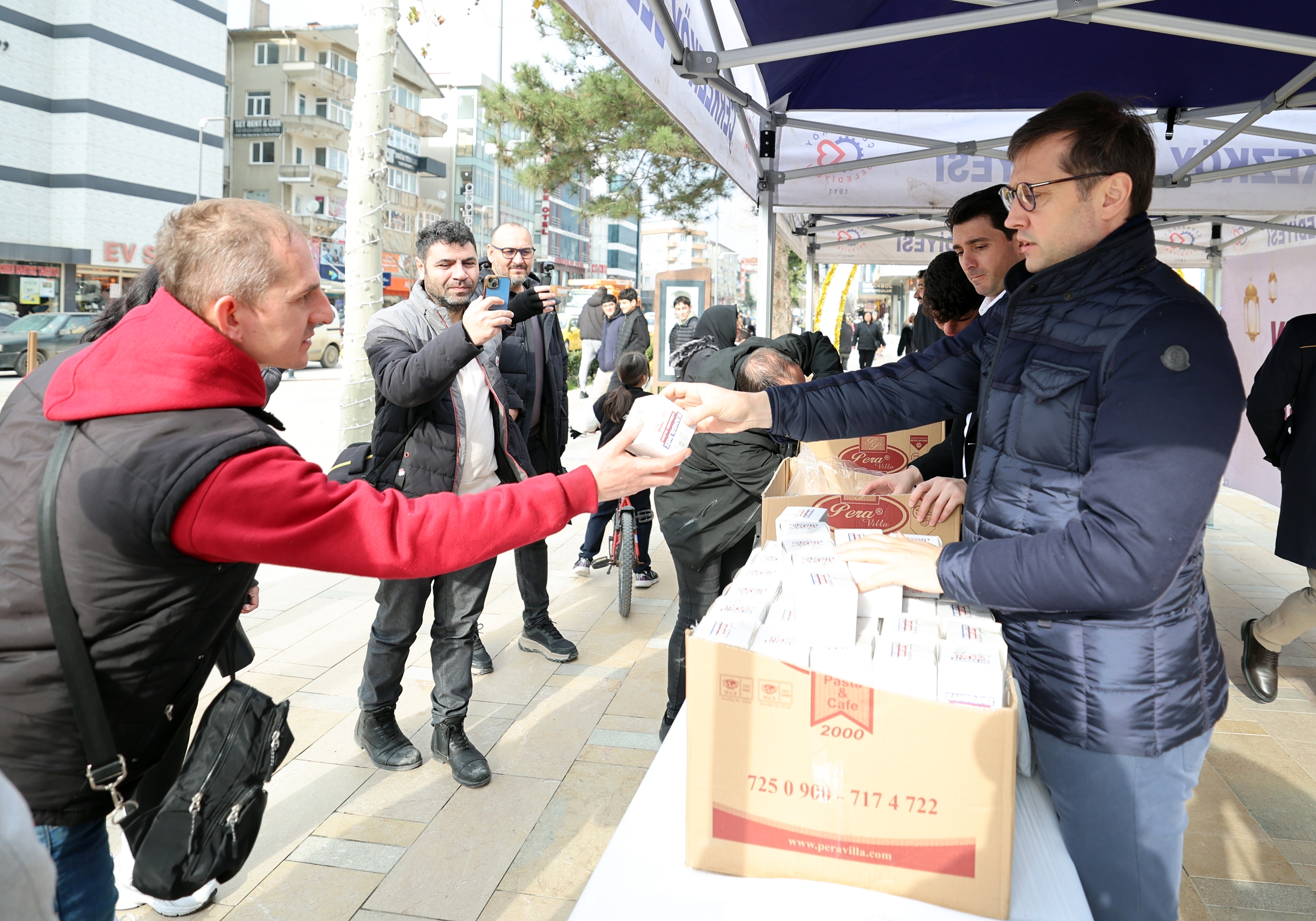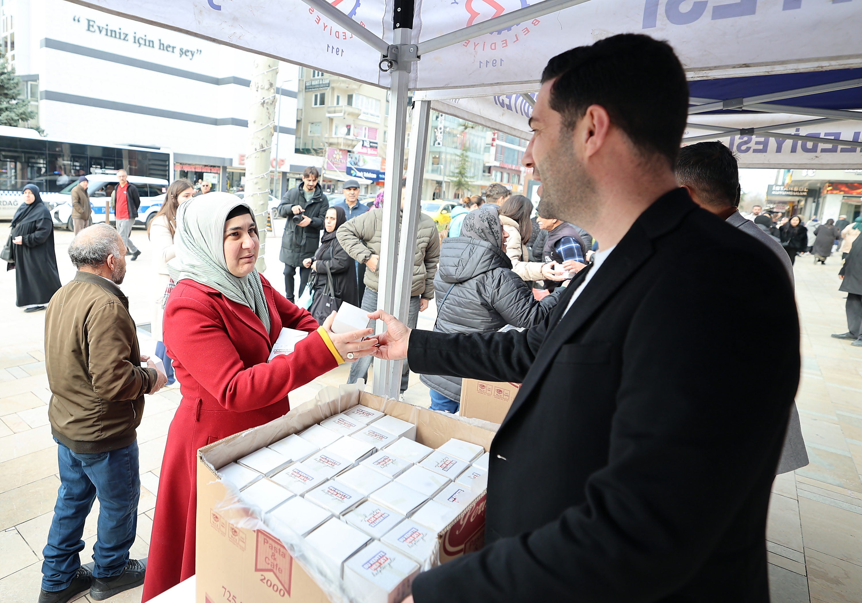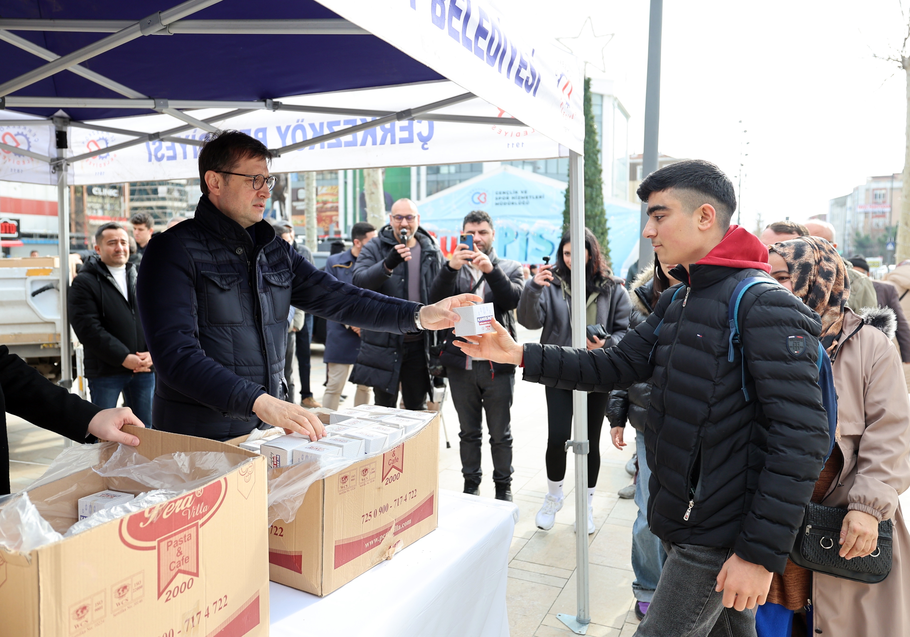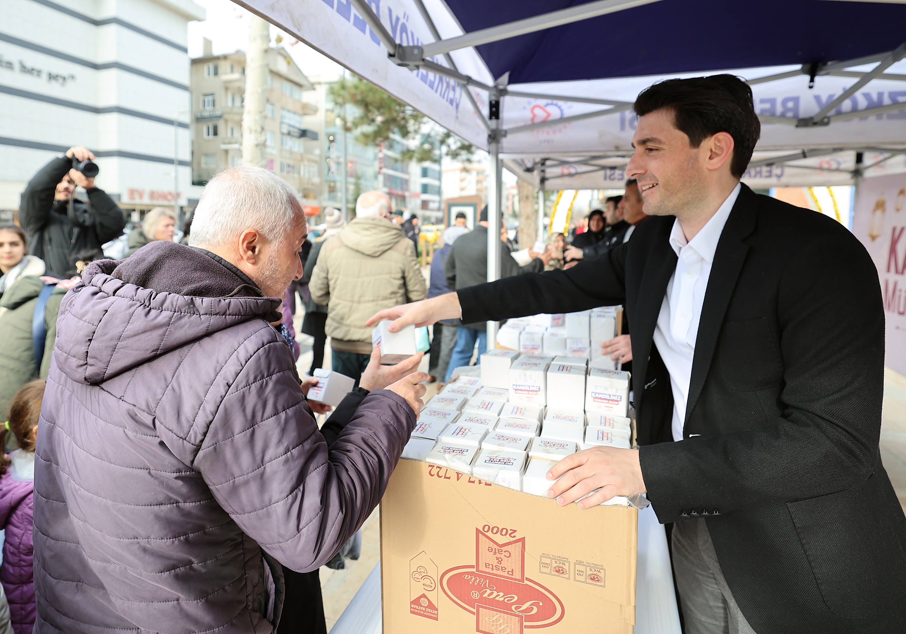 Miraç Kandili nedeniyle Sosyal Hizmetler Müdürlüğümüz tarafından kentimiz genelindeki kamu kurum ve kuruluşları ile Cumhuriyet Meydanı’nda oluşturulan stantta vatandaşlarımıza kandil simidi ikramında bulunuldu. Kandil simitlerini Belediye Başkanımız Vahap Akay, Belediye Başkan Yardımcılarımız Gökay Keleşoğlu ve Yunus Erçin’in elinden alan vatandaşlarımız Çerkezköy Belediyesi ve Belediye Başkanımız Vahap Akay’a kandil simidi ikramlarından dolayı teşekkürlerini ilettiler.