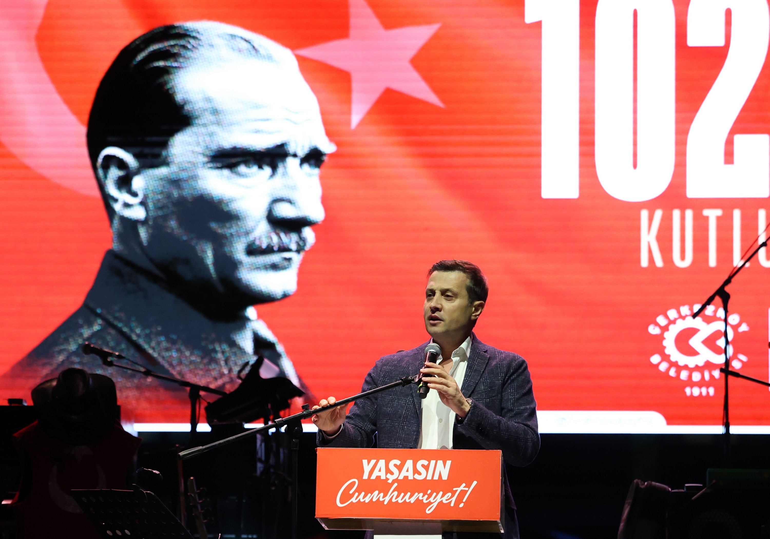Cumhuriyetin bu inatçı ruhun eseri olduğunu vurgulayan Belediye Başkanımız Vahap Akay, “Zindana attılar vazgeçmedi, sürgün edildi vazgeçmedi, İftira atıldı vazgeçmedi, davalar açtılar vazgeçmedi, yüzüstü bıraktılar vazgeçmedi, rütbelerini söktüler vazgeçmedi, idam fermanı boynunda memleketin dört bir yanında, aklında bir hayal var! O hayalin adı tek kelime Cumhuriyet.