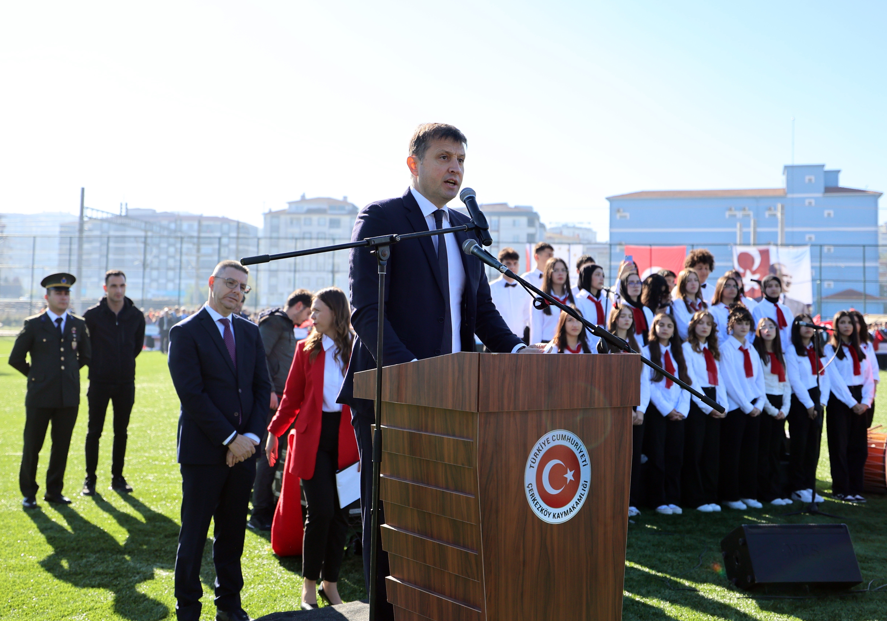 Tebrikat töreninin ardından kutlamalar, saat 10.30’da İstasyon Mahallesi’nde bulunan 29 Ekim Spor Kompleksi içerisindeki Futbol Sahası’nda devam etti. Çerkezköy Kaymakamı Nazmi Günlü, Tugay Komutanı Tuğgeneral Erkan Bulut ve Belediye Başkanı Vahap Akay, tören alanında bulunan halkın ve öğrencilerin 29 Ekim Cumhuriyet Bayramı’nı kutladı. Saygı duruşunda bulunulması ve istiklal marşının okunmasının ardından Çerkezköy Kaymakamı Nazmi Günlü günün anlam ve önemini belirten bir konuşma yaptı. Çerkezköy Kaymakamı Nazmi Günlü’nün konuşmasının ardından Belediye Başkanımız Vahap Akay, Çerkezköy’ün düşman işgalinden kurtuluşunun 103. Yılı ve Cumhuriyetimizin ilan edilişinin 102. Yılı nedeni ile bir konuşma gerçekleştirdi.