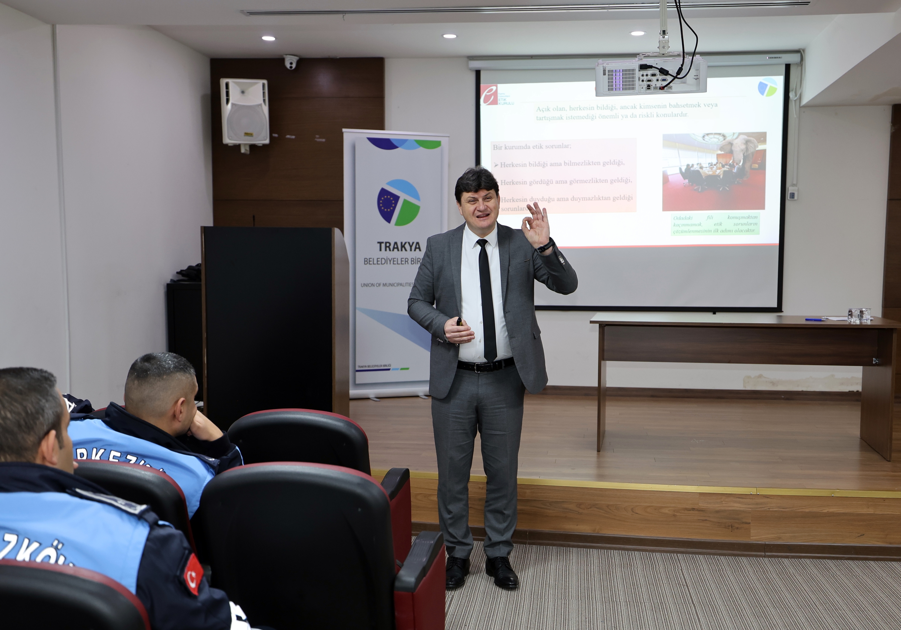 Çerkezköy Belediyesi Hizmet Binası Çok Amaçlı Salonu’nda 2 Aralık Salı günü İnsan Kaynakları Müdürlüğü tarafından düzenlenen eğitimde, Tekirdağ Büyükşehir Belediyesi Eğitim Şube Müdürü Erkan Ilgaz tarafından “Kamu görevlileri etik davranış ilkeleri ile başvuru usul ve esaslar” hakkında bilgiler verildi.