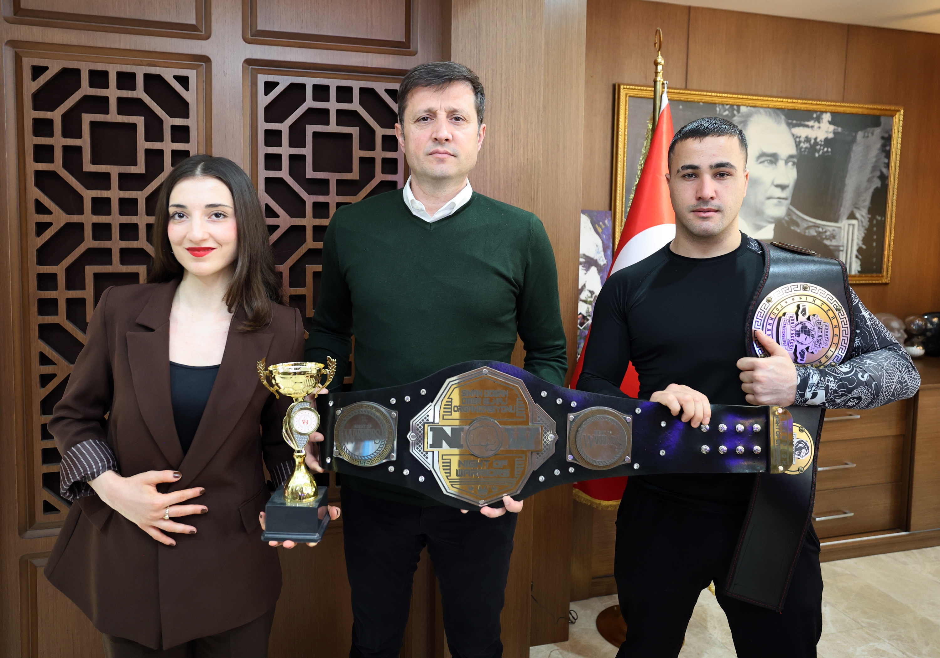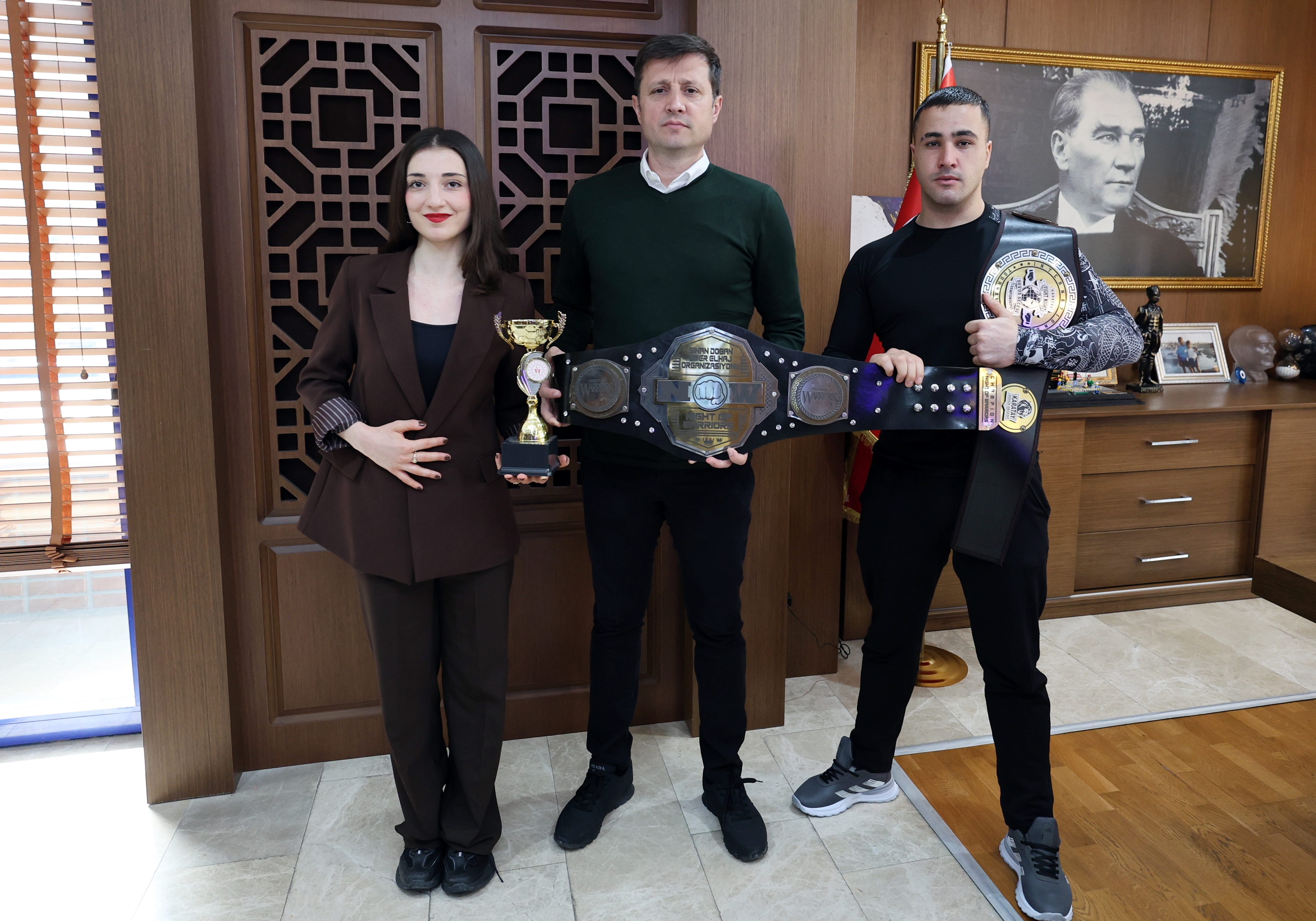 Ziyarette konuşan Hedef Fight Club Antrenörü Musa Durmaz, turnuvaya sporcusu Rumeysa Gündoğdu ile birlikte katıldıklarını belirterek, “Rumeysa, 53 kilo Büyük Kadınlar kategorisinde final müsabakasında İranlı rakibini ilk rauntta nakavt ederek şampiyon oldu. Ben de 81 kilo Büyük Erkekler kategorisinde finalde Gürcistanlı rakibimi mağlup ederek altın kemerin sahibi oldum. Kentimizi ve bölgemizi en iyi şekilde temsil etmenin gururunu yaşıyoruz. Çalışmalarımıza aynı azim ve kararlılıkla devam edeceğiz” ifadelerini kullandı.